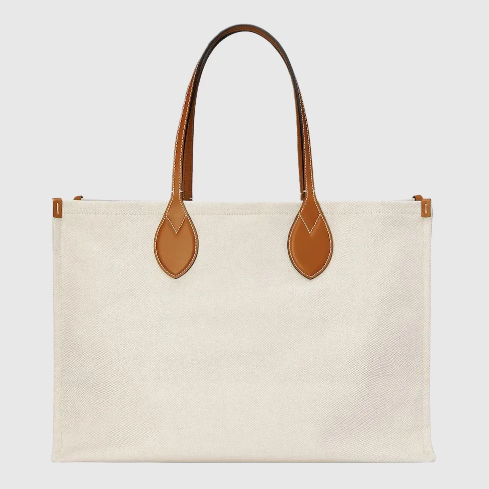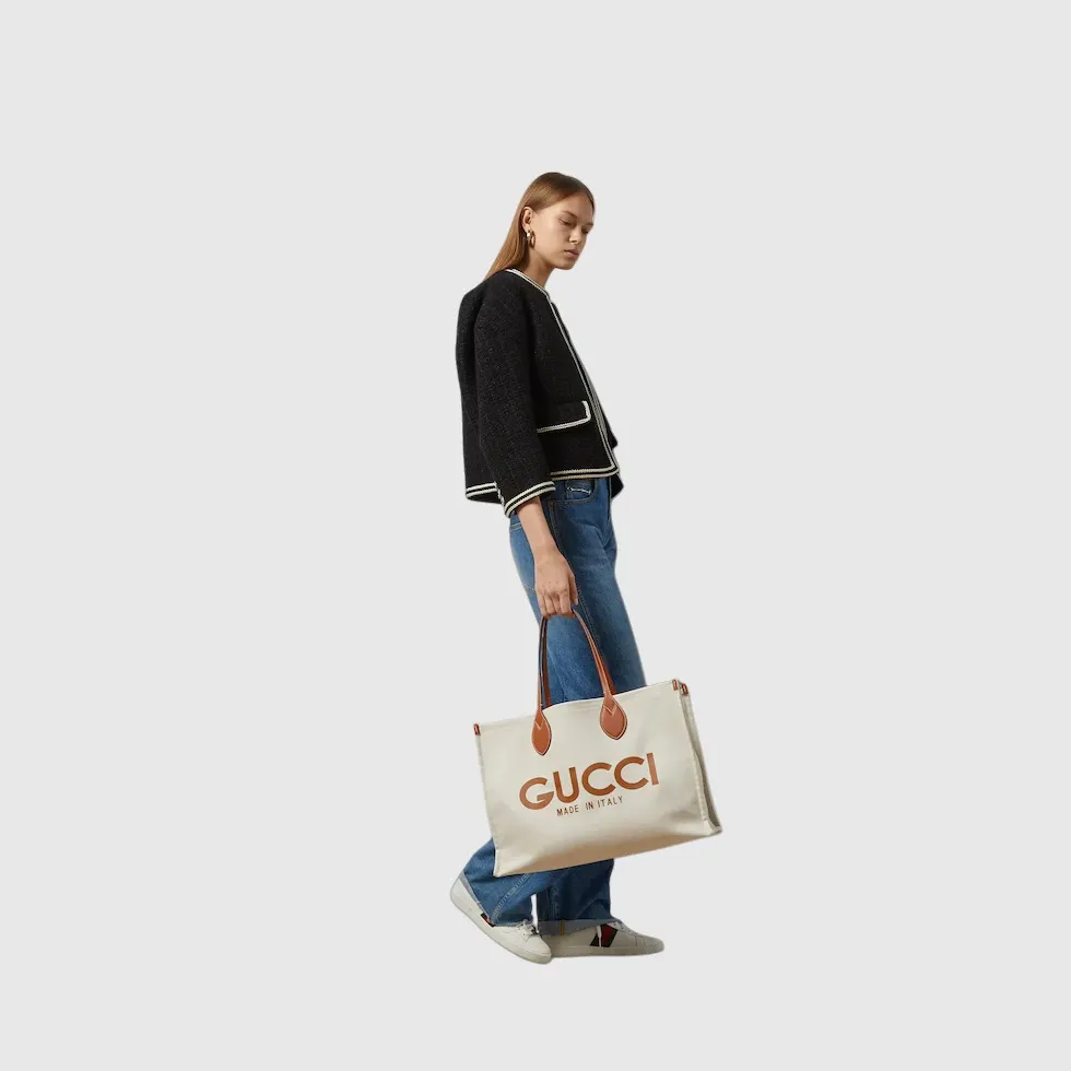 Well-known prints of the House constantly evolve to tell a unique narrative. An essential storytelling element of the Cruise 2024 collection, the ‘Gucci Made in Italy’ print defines this beige canvas tote bag with a light brown trim and GG Supreme lining.Beige cotton linen canvas