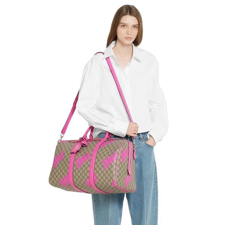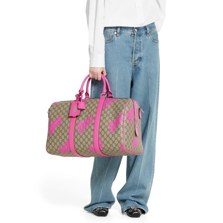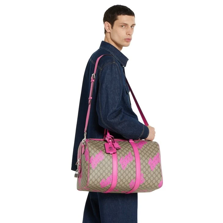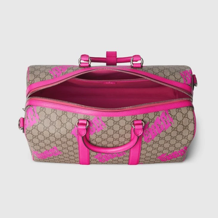 In the Pre-Fall 2025 collection, Chinese artist Currynew (Xiang Zhang) puts a twist on the House logo across men’s ready-to-wear, leathergoods, and accessories. This duffle bag is presented in a GG Monogram coated fabric, complete with a Gucci print and contrasting leather trim.Beige and dark brown GG Monogram coated fabric
