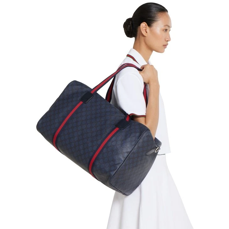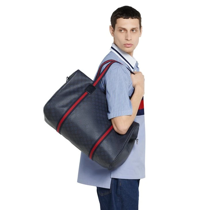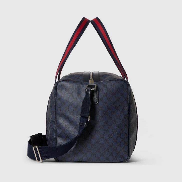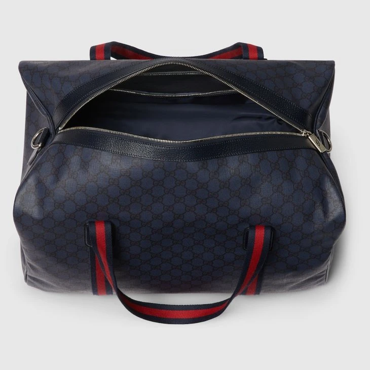 A softer GG Supreme enriches Gucci Tennis pieces in a new shade of dark blue. This duffle bag is presented in the material variation and enriched with a blue and red Web stripe and a dark blue leather trim.Dark blue soft GG Supreme