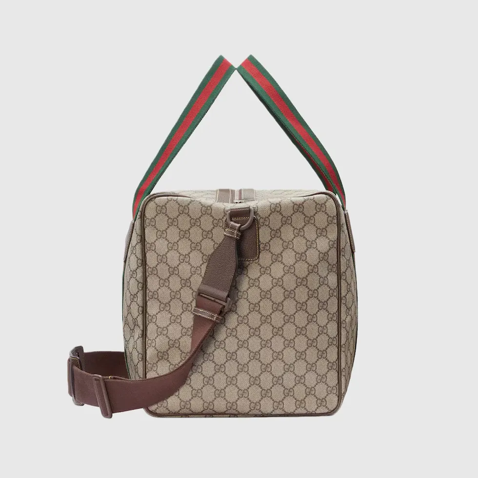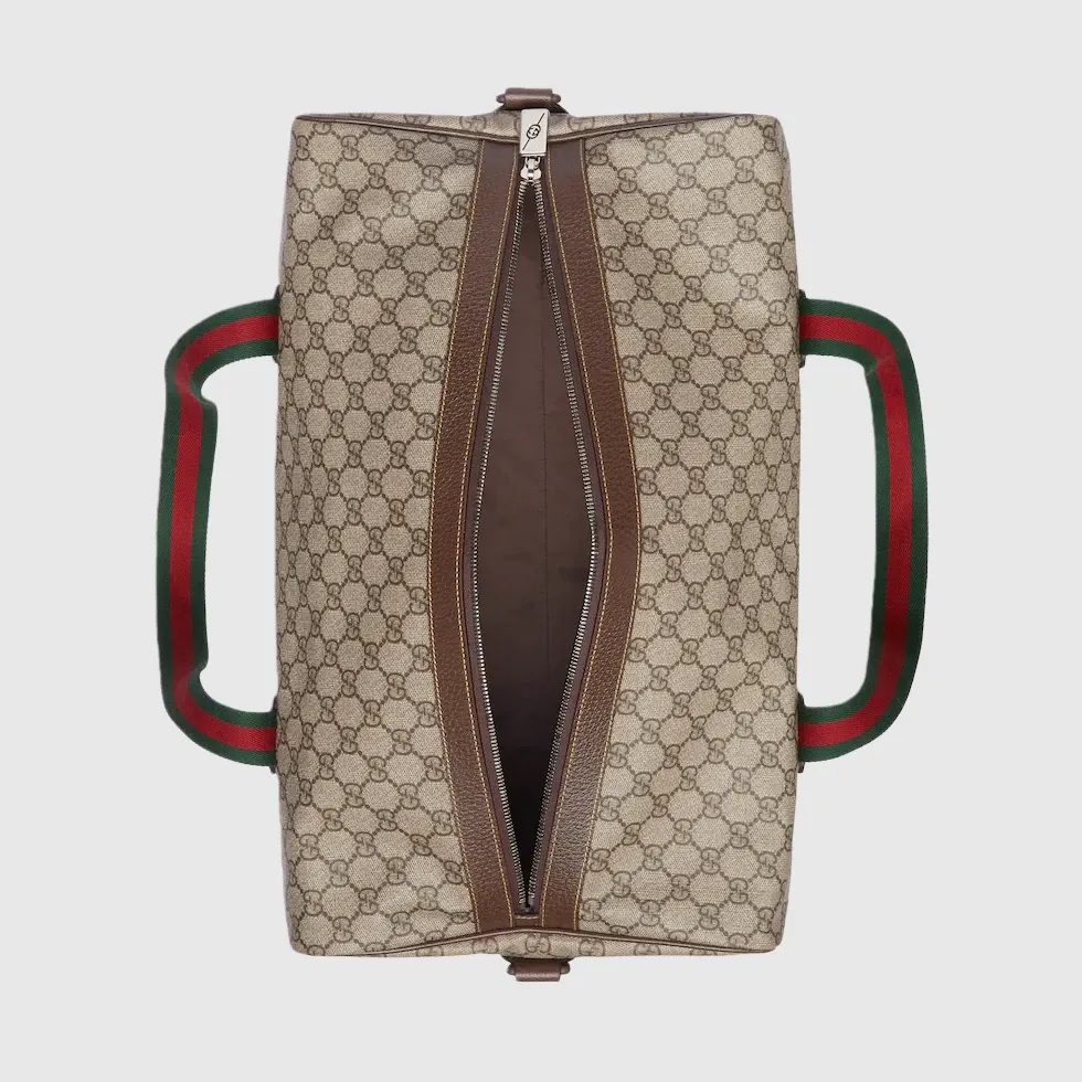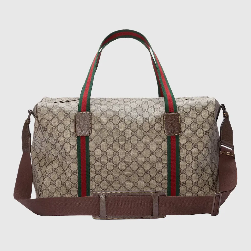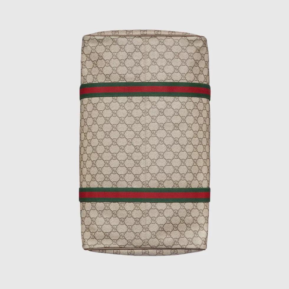 The GG Supreme is inspired by an archival design from the 1930s and remains one of the House’s most emblematic materials. Here, the classic palette defines this duffle bag. A green d and red Web completes the travel piece.Beige and ebony Soft GG Supreme