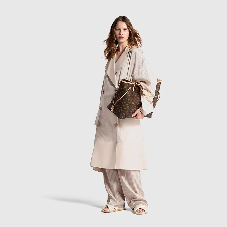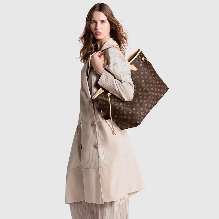 The Neverfull GM tote unites timeless design with heritage details. Made from supple Monogram canvas with natural cowhide trim, it is ultra-roomy but never bulky, with side laces that cinch for a sleek allure or loosen for a more casual look. Slim, comfortable handles slip easily over the shoulder or arm. Lined in colorful textile, it features a removable pouch which can serve as a clutch or an extra pocket.