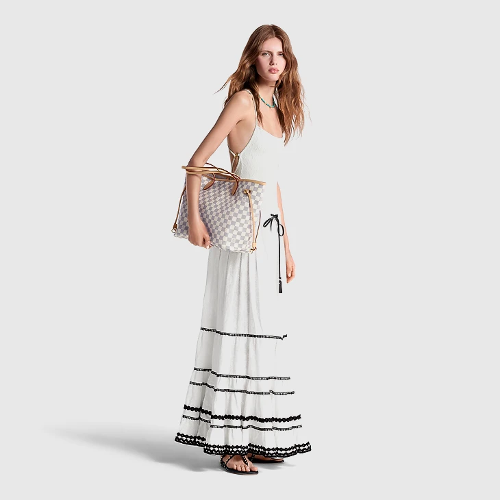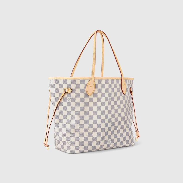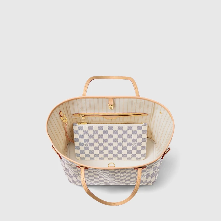 The Neverfull MM tote unites timeless design with heritage details. Made from fresh Damier Azur canvas with natural cowhide trim, it is roomy yet not bulky, with side laces that cinch for a sleek allure or loosen for a casual look. The slim leather handles slip easily over the shoulder or arm. Lined in colorful textile, it features a removable pouch which can be used as a clutch or an extra pocket.