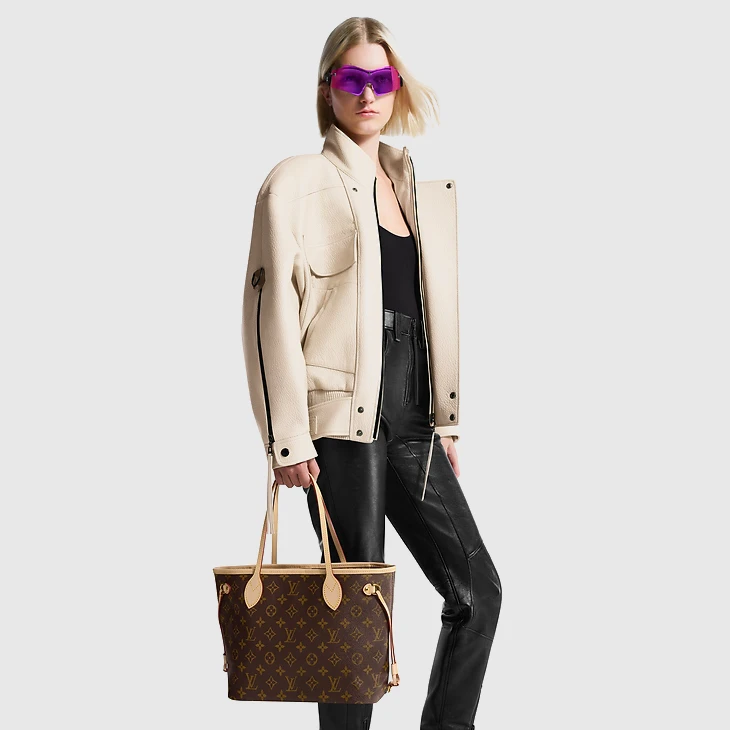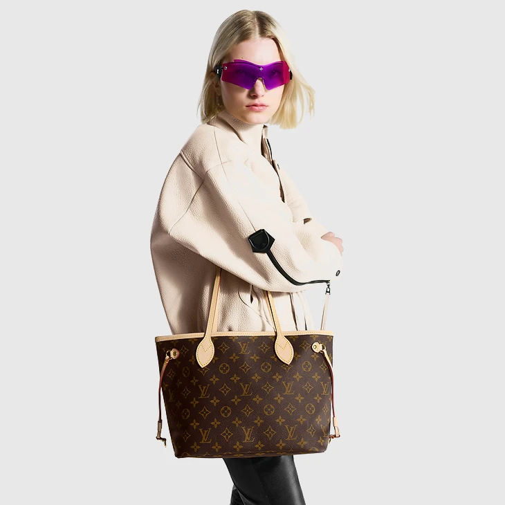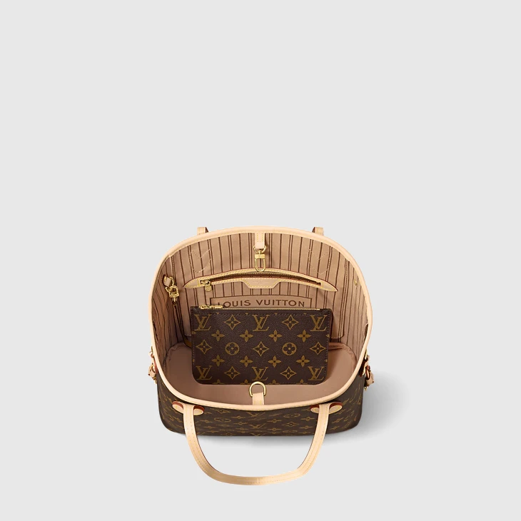 The Neverfull PM tote pairs timeless design with heritage details. Crafted from Monogram coated canvas with natural cowhide trim, it is capacious yet not bulky, with side laces that cinch for a sleek allure or loosen for a casual look. Slim, comfortable handles slip easily over the shoulder or arm. Lined in colorful textile, it features a removable pouch which can be used as a clutch or an extra pocket.