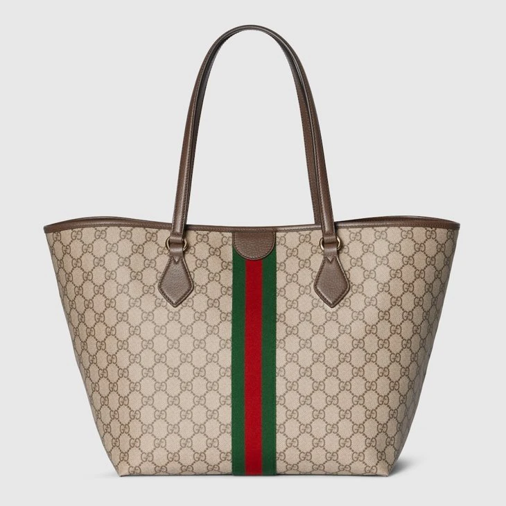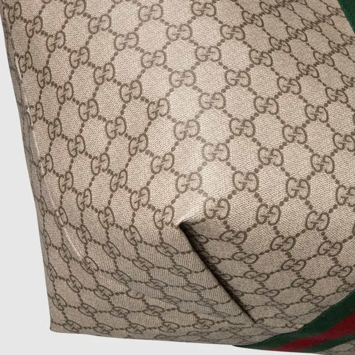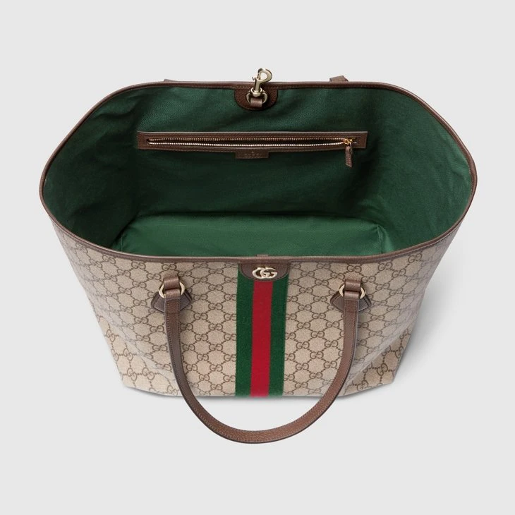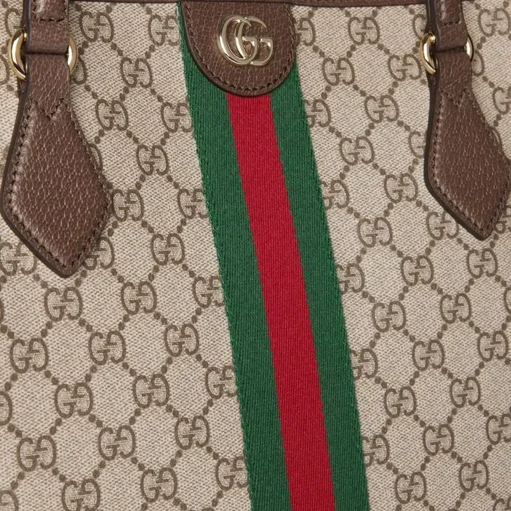 The Ophidia collection evokes the House’s heritage with the signature Web stripe and Double G emblem in light gold-toned finish. The styles are crafted from soft GG Monogram coated fabric, featuring green cotton lining inside.Beige and dark brown GG Monogram coated fabric