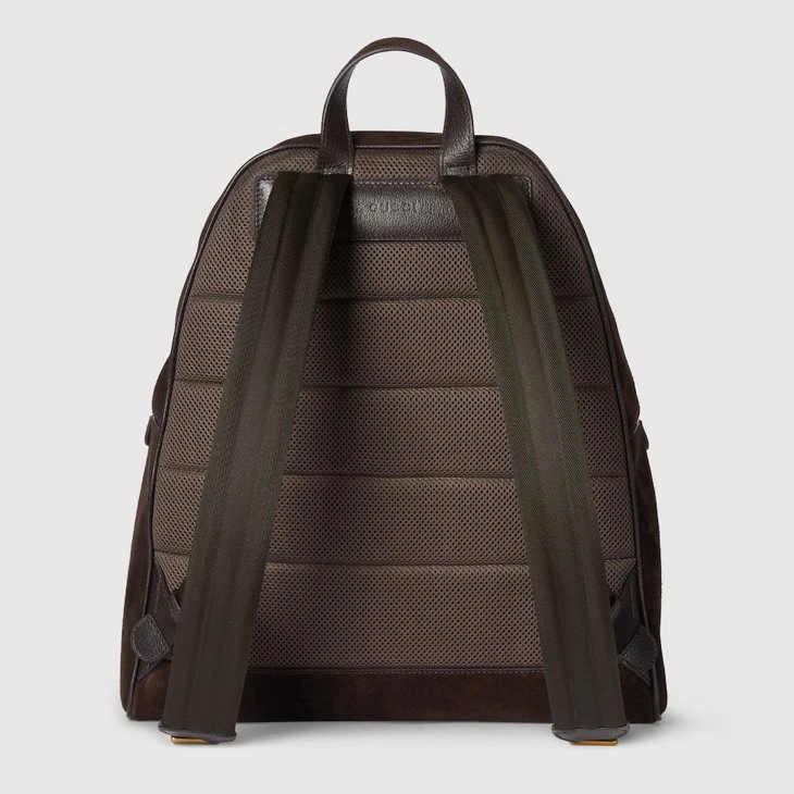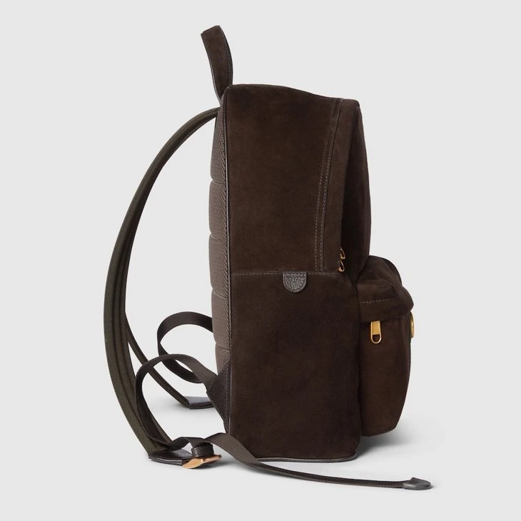Ophidia offers signature silhouettes and functions crafted with a sophisticated touch. This backpack features a soft, lightweight suede, a Double G, as well as green and red Web detail.Dark brown lightweight soft suede