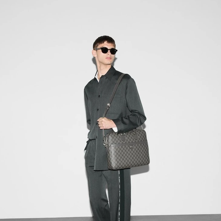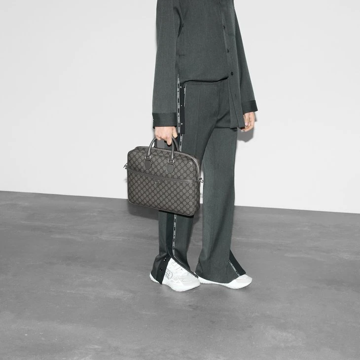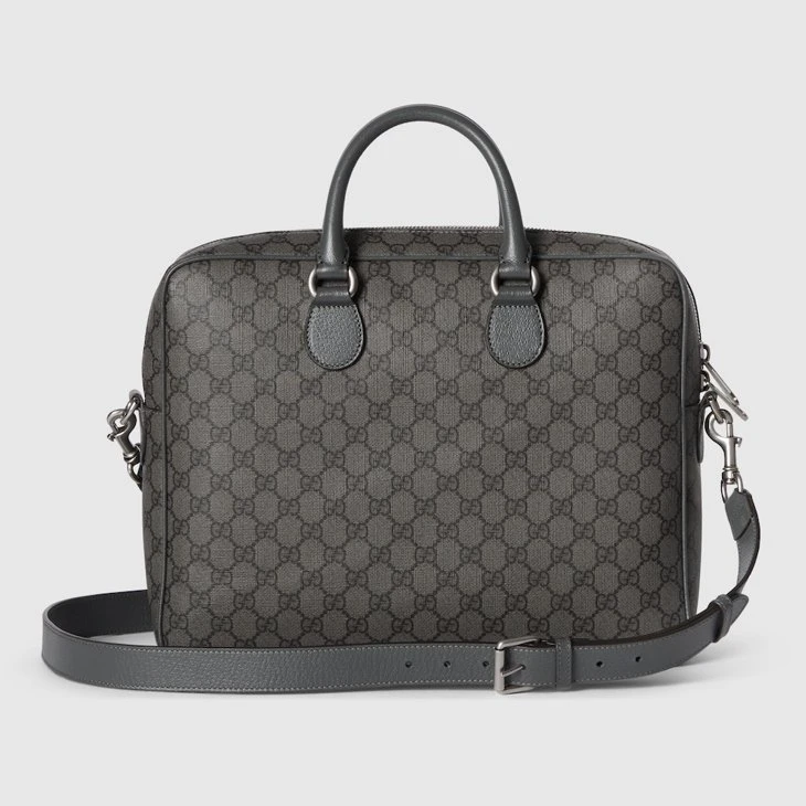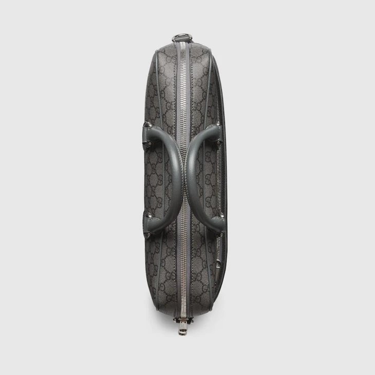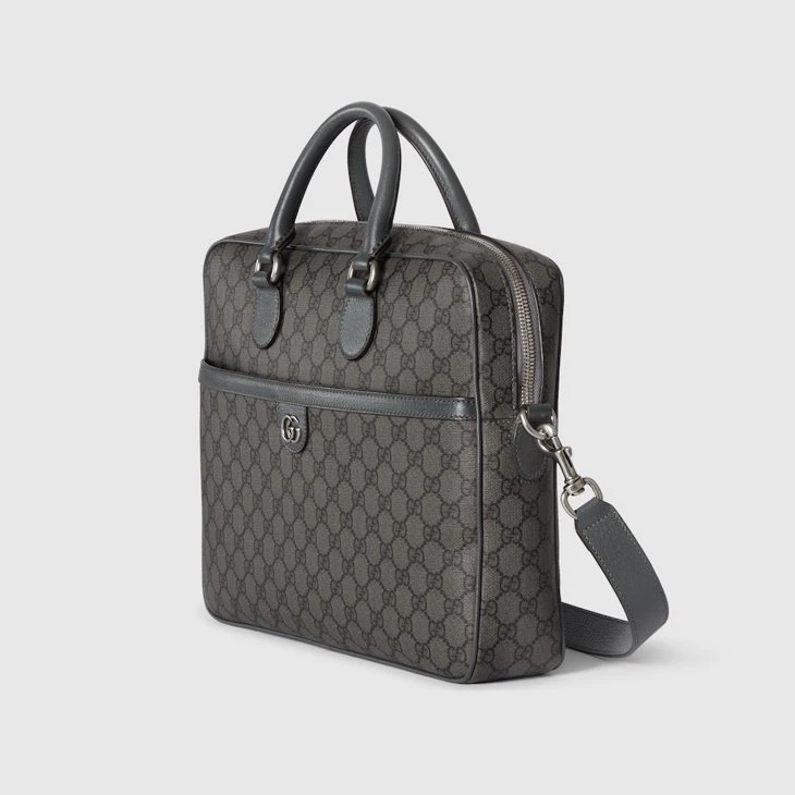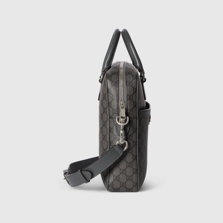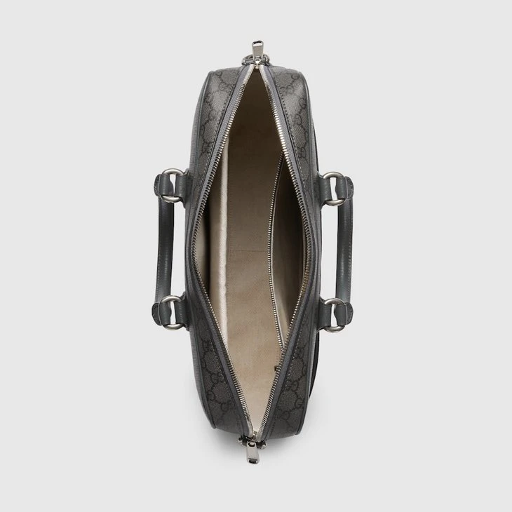 A selection of bags, including mini cross-body bags, briefcases and totes have been reshaped with functional details. Featuring a light construction in a neutral color palette, the GG motif defines each style as an integral design element. As part of the Ophidia line, this dark grey and black GG Supreme canvas briefcase is enriched with the Double G motif.Dark grey and black GG Supreme canvas