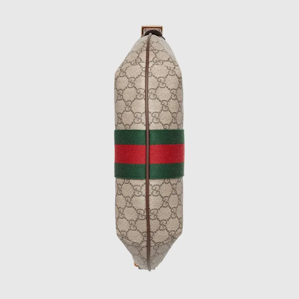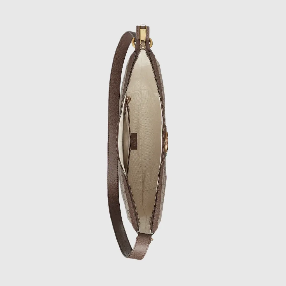 A classic combination of the House’s most recognizable elements—the GG motif and Web stripe—the world of Ophidia continues to evolve, incorporating new shapes and silhouettes. The half-moon design mixes emblematic references with the unique charms of the crossbody bag, a popular Gucci model since the late ’50s. Crafted in GG Supreme canvas, it’s trimmed with textured leather and topped with Double G hardware.Beige/ebony soft GG Supreme, crafted from a coated microfiber fabric, with brown leather trim