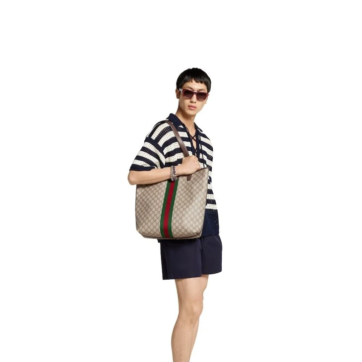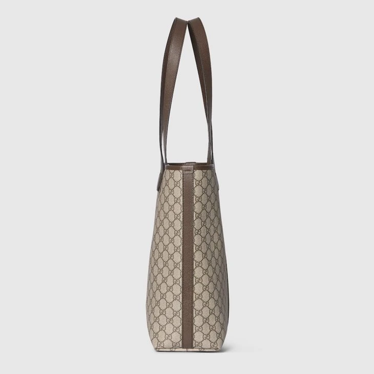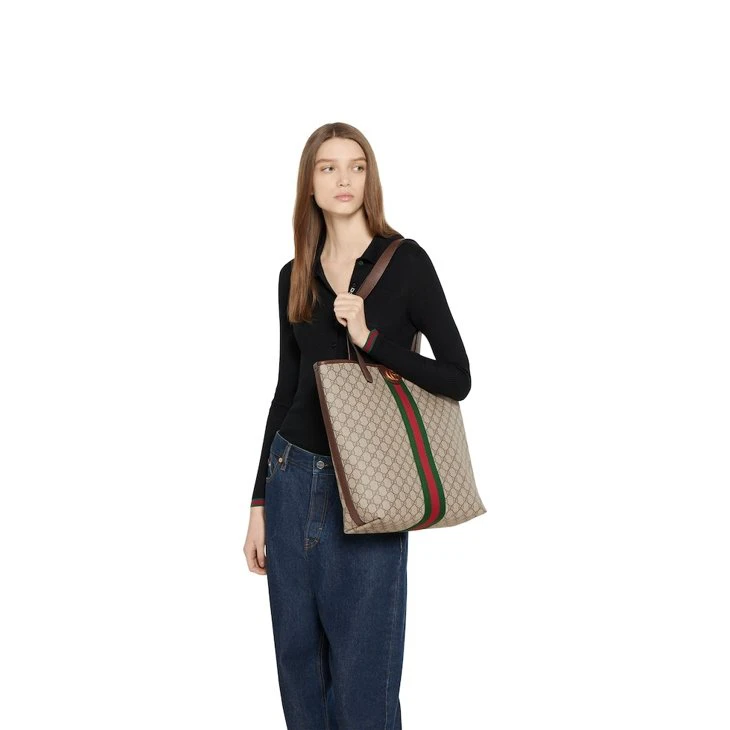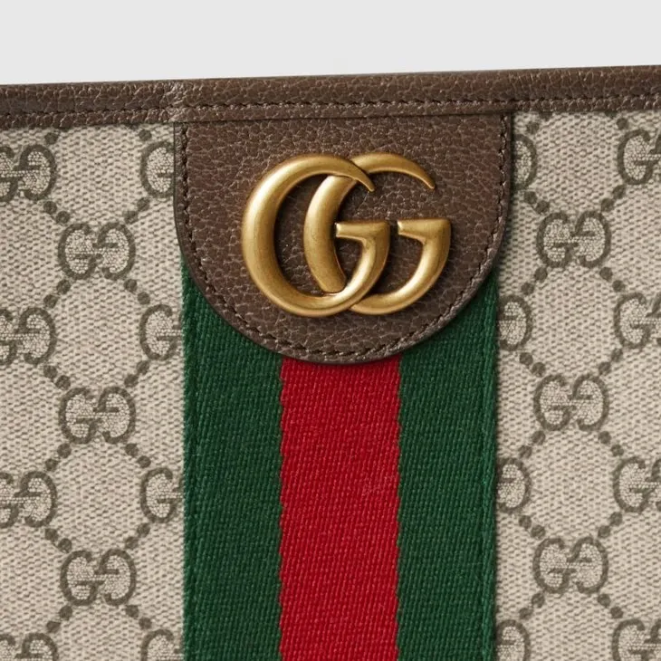 The Ophidia collection evokes the House’s heritage with the signature Web stripe and Double G emblem in light gold-toned finish. The styles are crafted from soft GG Monogram coated fabric, featuring green cotton lining inside.Beige and brown GG Monogram coated fabric