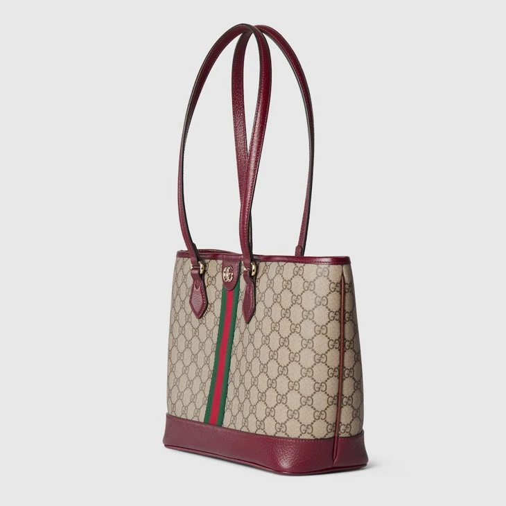 The Ophidia collection evokes the House’s heritage with the signature Web stripe and Double G embleBeige and dark brown GG Monogram coated fabric