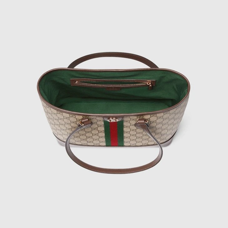 The Ophidia collection evokes the House’s heritage with the signature Web stripe and Double G emblem in light gold-toned finish. The styles are crafted from soft GG Monogram coated fabric, featuring green cotton lining inside.Beige and dark brown GG Monogram coated fabric