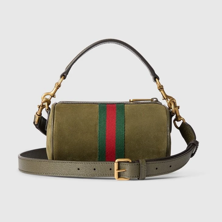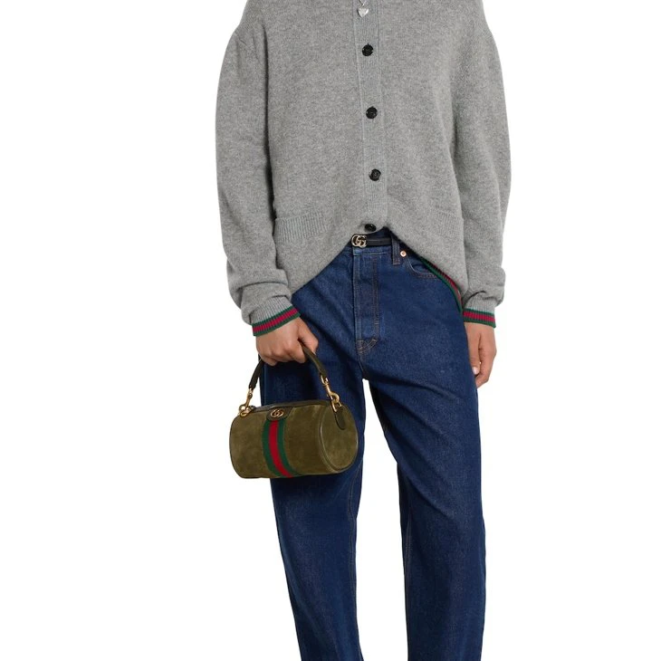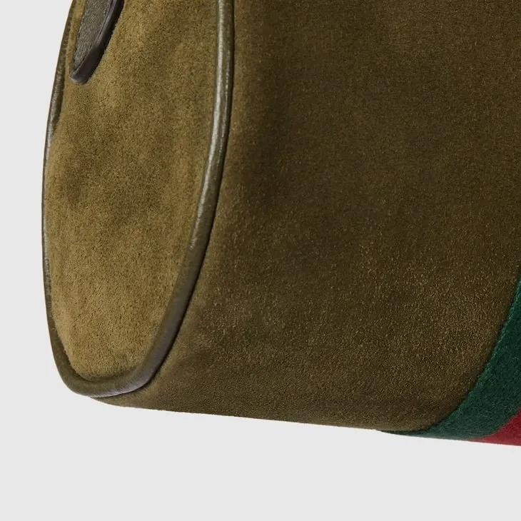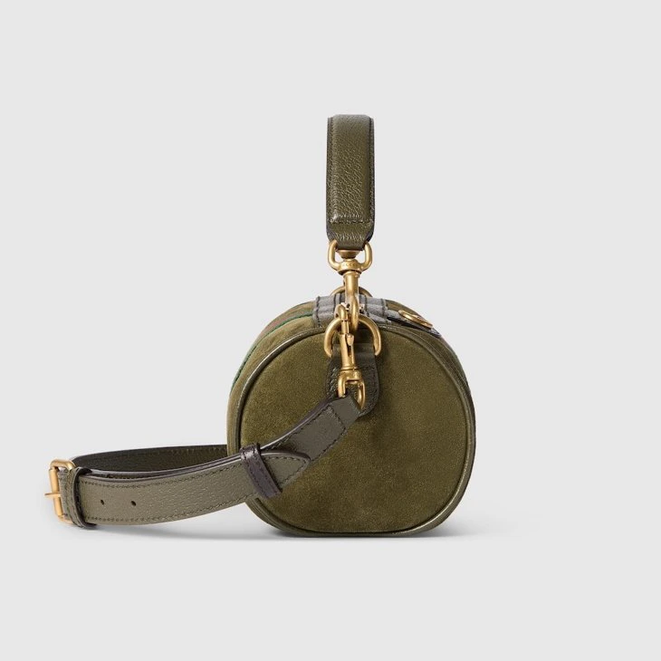 In the Fall Winter 2025 collection, the Ophidia collection reveals a Web stripe and Double G emblem in a gold-toned finish. This mini bag is presented in dark green suede with a green and red Web stripe and an adjustable leather shoulder strap.Dark green suede