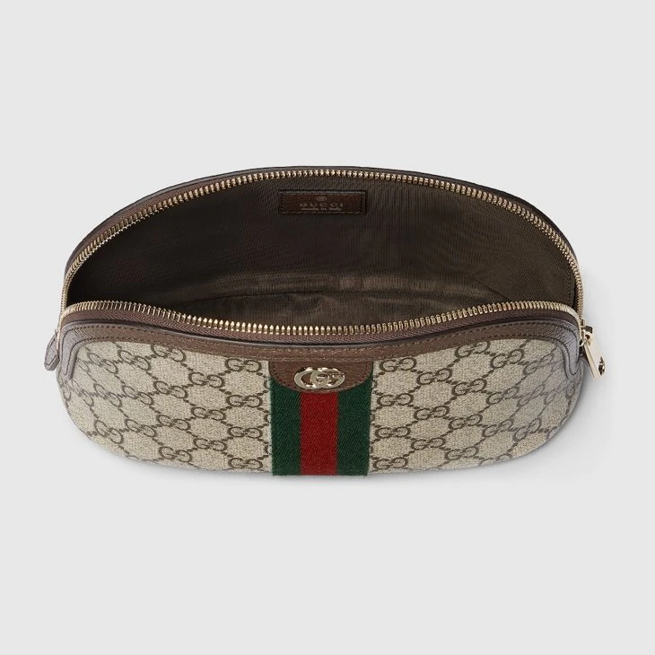 The Ophidia collection evokes the House’s heritage with the signature Web stripe and Double G embleBeige and dark brown GG Monogram coated fabric