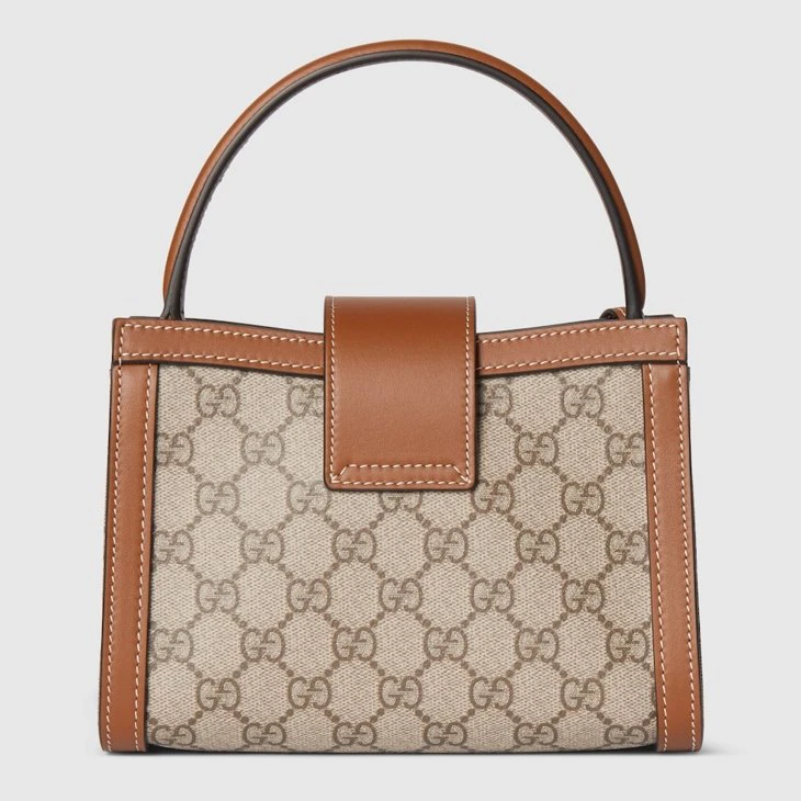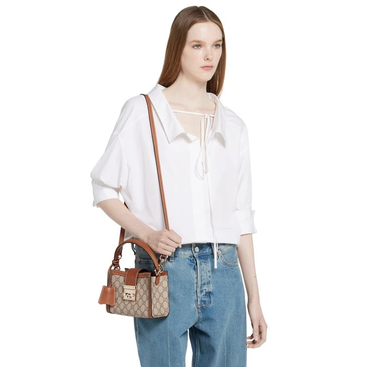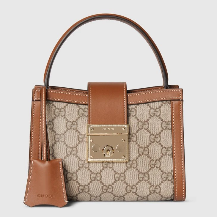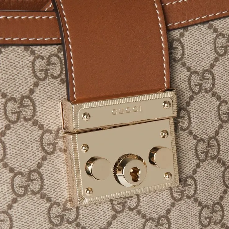 In the Pre-Fall 2025 collection, the Padlock introduces contemporary silhouettes that offer many wearabilities. The top handle bag reveals a Web lining which recalls the House’s signature motif.Beige and dark brown GG Monogram coated fabric