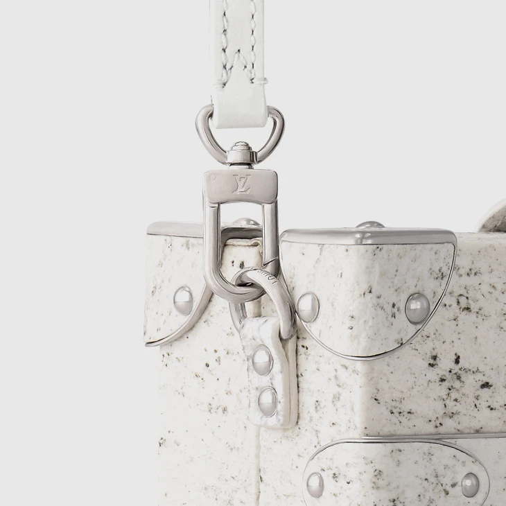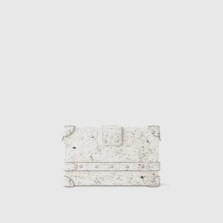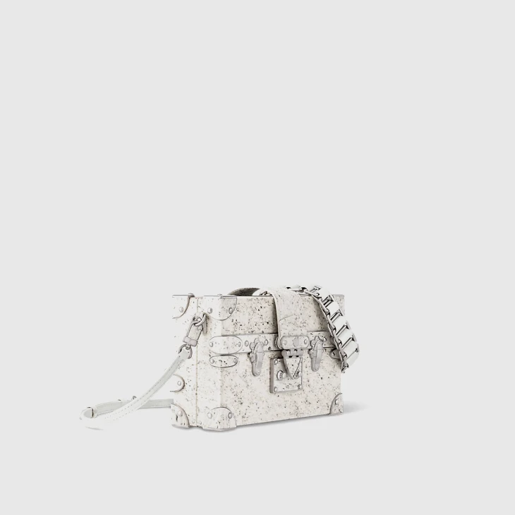 2024 marks the 10th anniversary of the iconic Petite Malle, the first handbag created by Nicolas Ghesquière for Louis Vuitton. This celebratory version highlights a trompe l’oeil effect, using an innovative technique where mica stone leaves are extracted by hand and inlaid delicately onto the wooden frame. It is embellished with brushed hardware and includes a braided leather chain. The sheepskin lining is elevated with a limited-edition plaque.