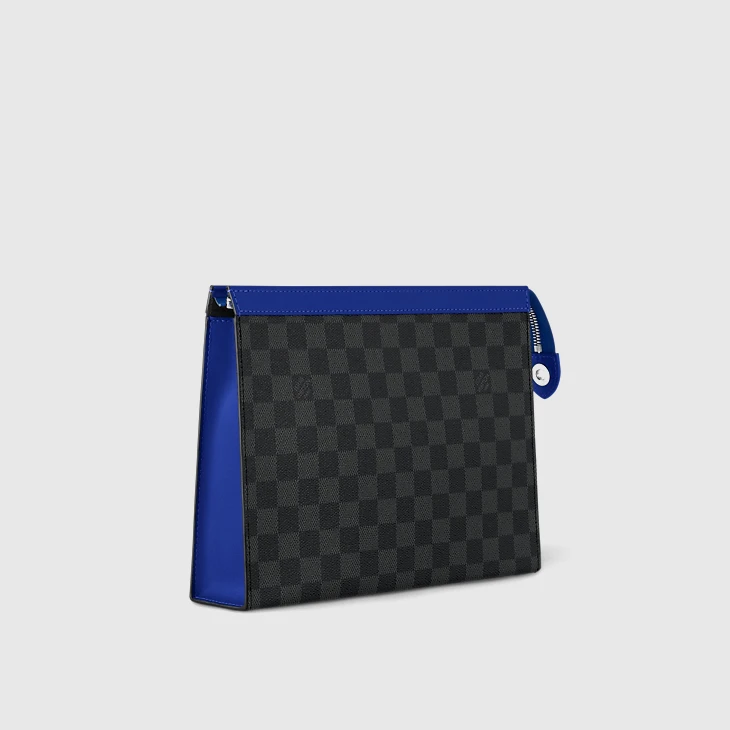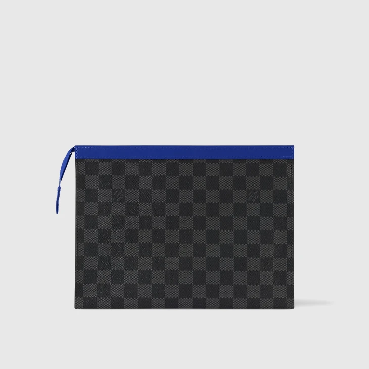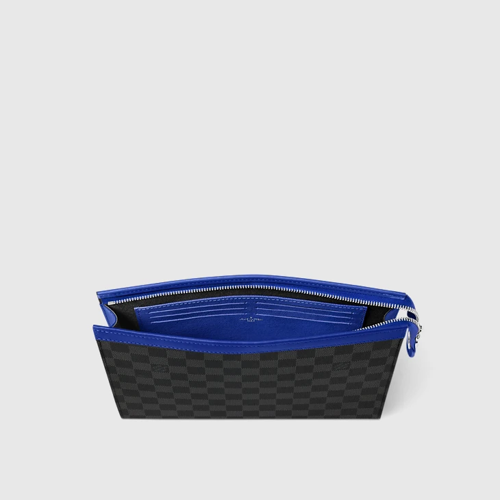 The Pochette Voyage MM in Damier Graphite canvas is trimmed with vibrant blue leather along the top, bringing a fresh twist to the Pochette’s simple design. This stylish pouch can be carried as a clutch or used inside a suitcase to keep toiletries or papers organized. Inside, there’s a flat pocket and six card slots.