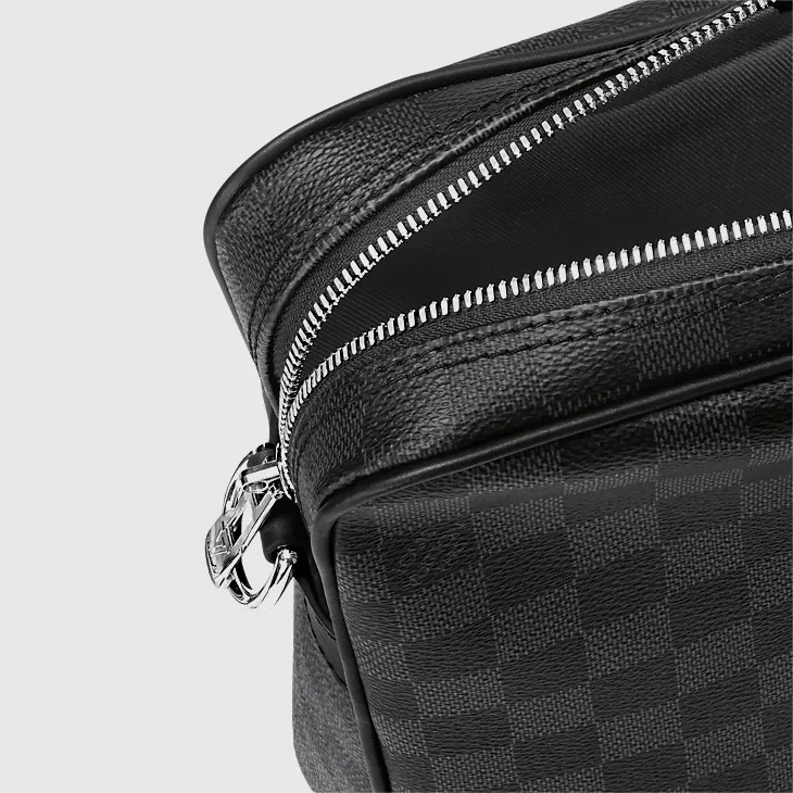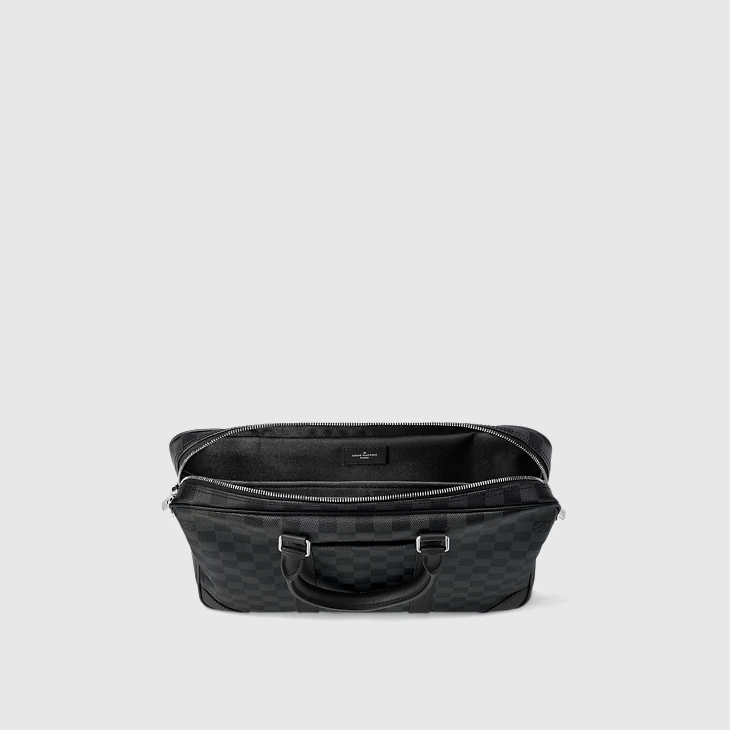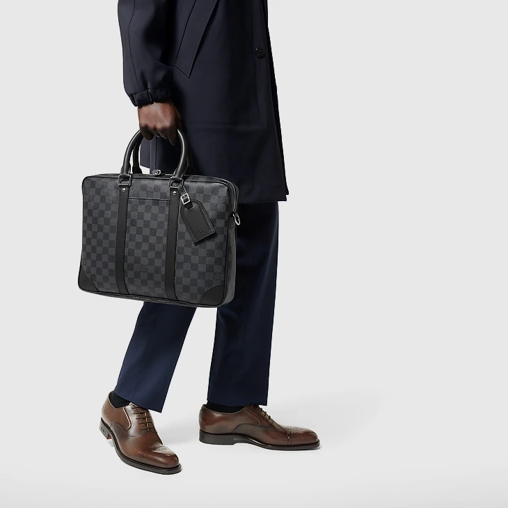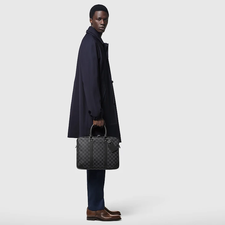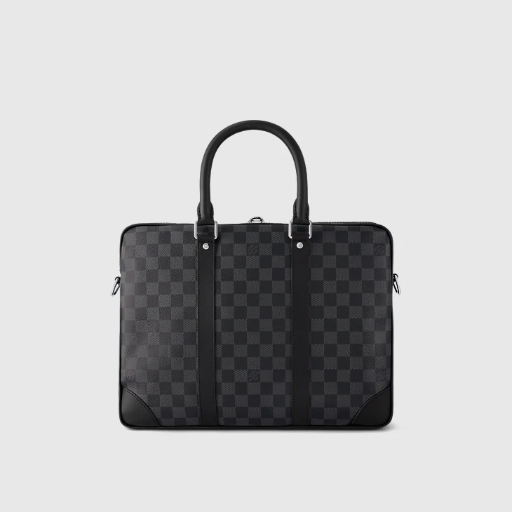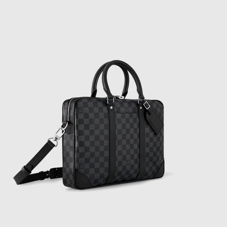 The Porte-Documents Voyage PM briefcase is made from Damier Graphite coated canvas with black-leather side bands, reinforced corners, top handles, and name tag. There’s an outside pocket for a smart phone and a padded interior compartment large enough for a 13-inch laptop. The removable and adjustable strap enables shoulder carry.