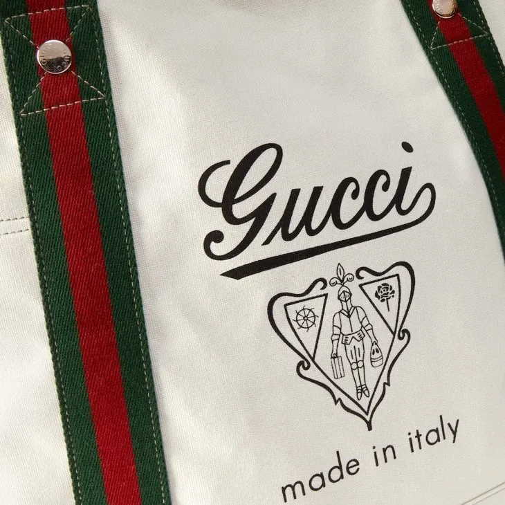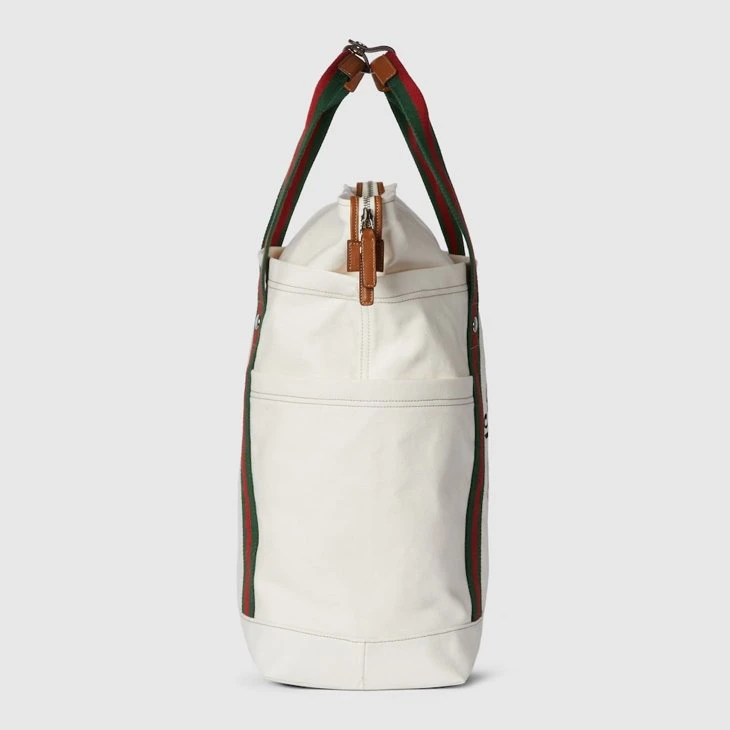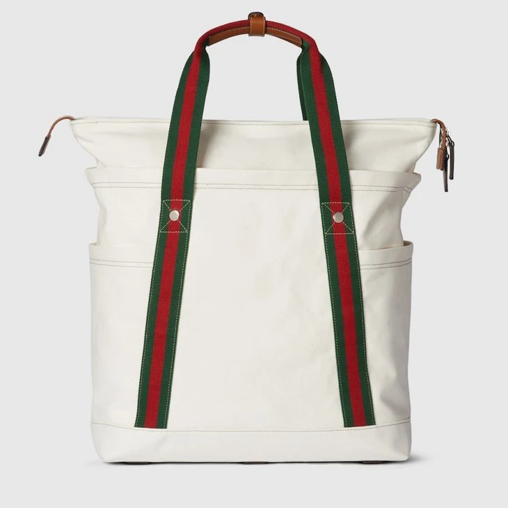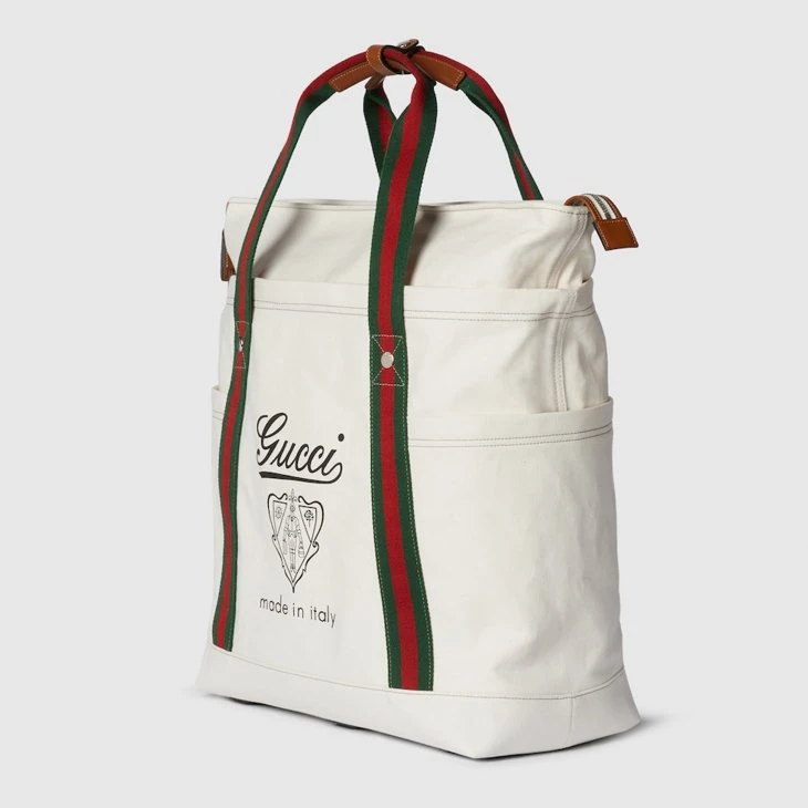 The Spring Summer 2025 men’s collection speaks of freedom, energy and community through the latest selection of travel pieces and men’s bags fit for new adventures. This canvas bag with a brown leather trim and top stitch detailing, features a Gucci Made in Italy crest print across the front.Off white canvas