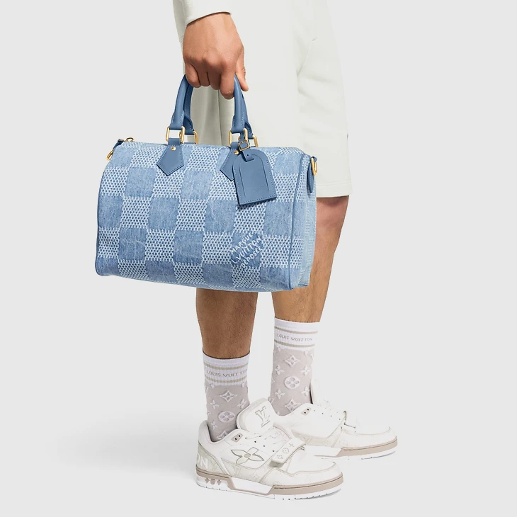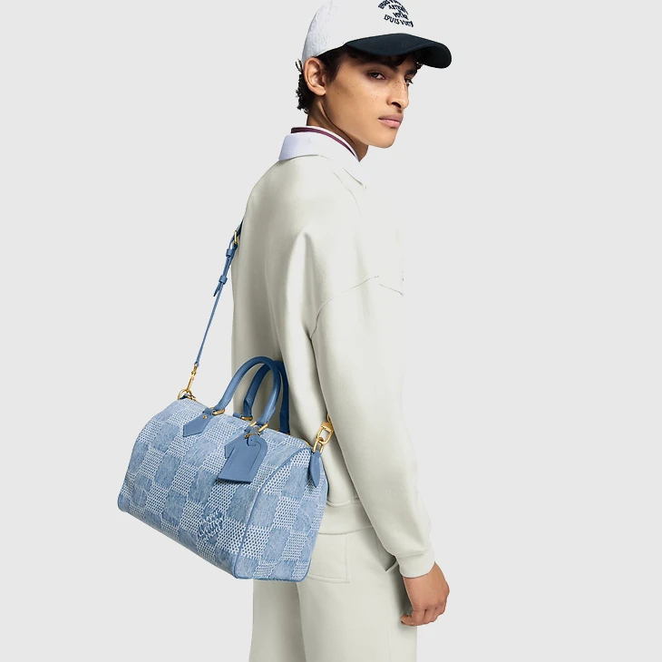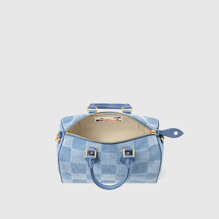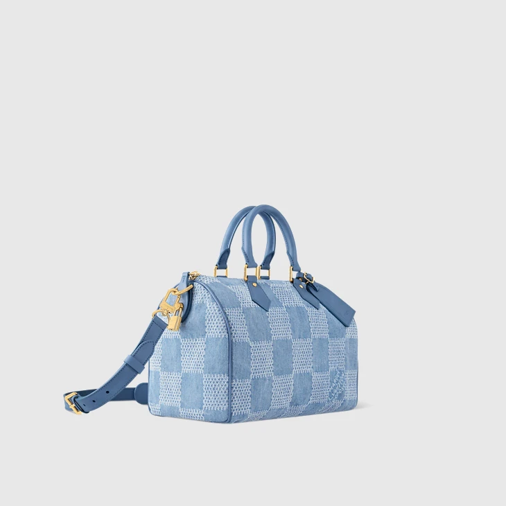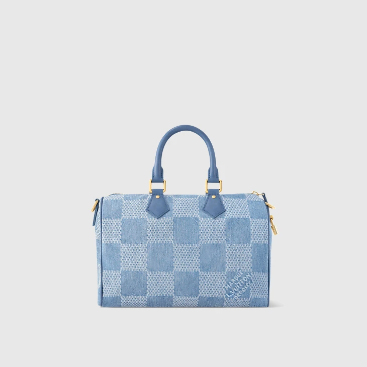 Introduced at Pharrell Williams’ first Louis Vuitton Ready-to-Wear collection, Damier Denim 3D cotton canvas comes to the Speedy 30 Bandoulière. This casual reimagining of the House’s iconic Damier checkerboard pattern gives the city bag a timeless urban feel. Matching blue leather top handles and a removable, adjustable shoulder strap offer carry options.