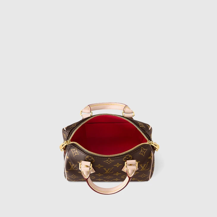 Like a diminutive version of the House’s historic Speedy travel bag, the Speedy Bandoulière 20 handbag is crafted from Monogram canvas with natural cowhide trim. In addition to the rolled leather top handles, there’s a wide detachable and adjustable textile strap with a woven Louis Vuitton signature. This bag’s classic design is completed with red textile lining.