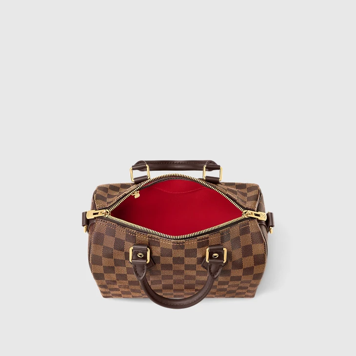 The Speedy Bandoulière 25 in graphic Damier Ebene canvas is an ideal city bag for every day. Originally created for travelers in the 1930s – the name refers to the era’s rapid transit – every feature of the Speedy’s design is iconic, from its unmistakable shape to the rolled leather handles, engraved padlock and detachable strap.