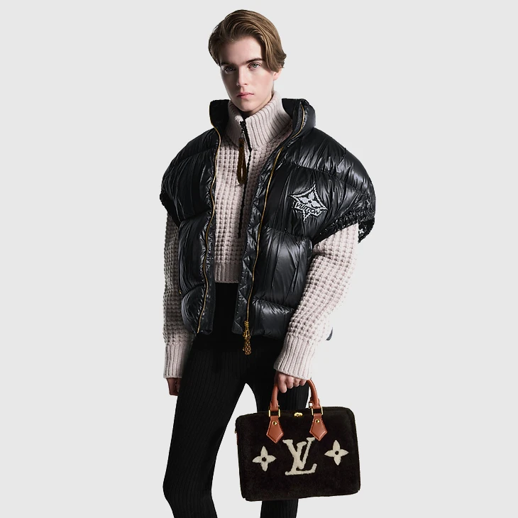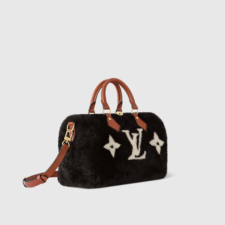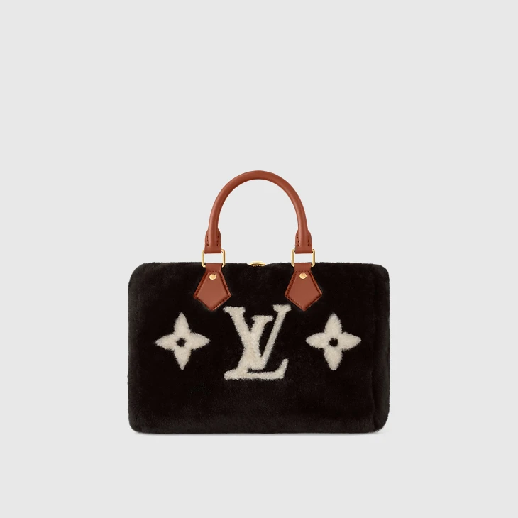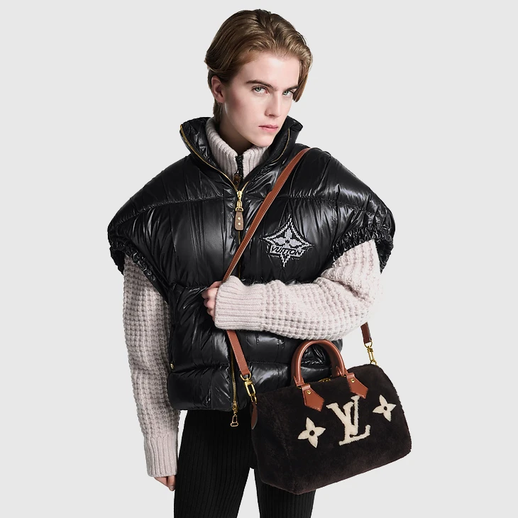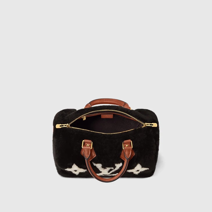 From the LV Ski Cozygram collection, this Speedy Bandoulière 25 showcases a new Monogram version in a beautiful chocolate and cream palette. It is crafted from ultra-soft merino-sourced shearling, elevated with smooth leather trims and gold-toned hardware, including a signature padlock. Inside, there is enough space for a Smartphone, wallet and keys, plus a mini tablet and makeup essentials.