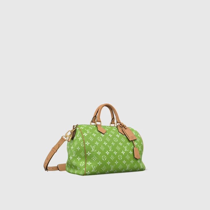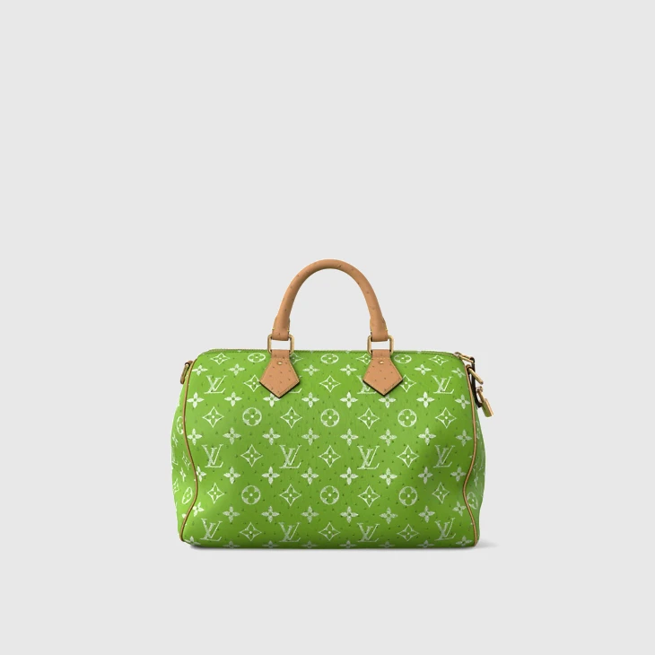 The Speedy P9 40, with its slouchy silhouette, is made from ostrich leather with a Monogram print. The pattern is printed on the leather using a sophisticated silk-screen technique that reproduces the twill aspect of the Monogram on canvas. Lined in lambskin, the interior includes a trio flat pocket and a zipped pocket.