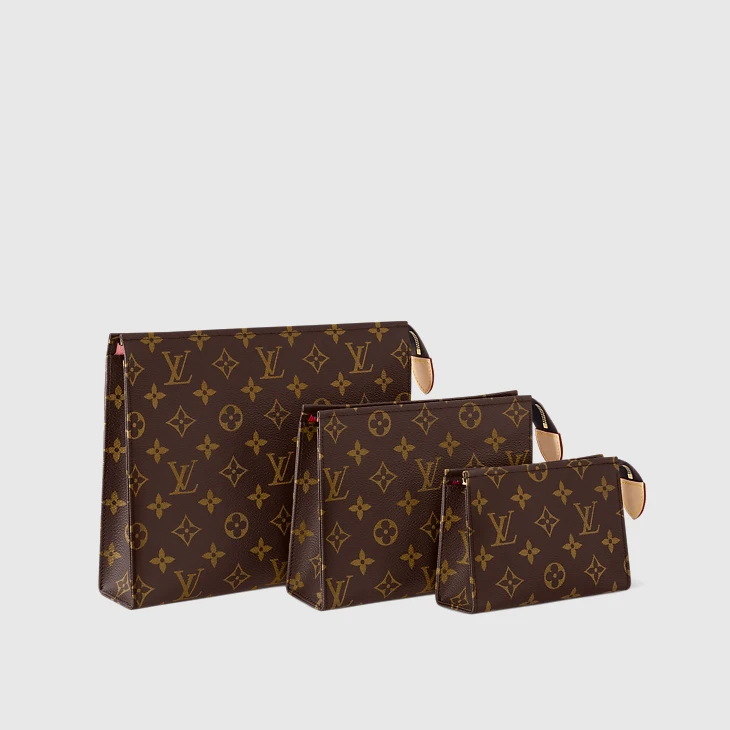 The Trio Toilet Pouch is a set of three, different-sized, classic Louis Vuitton pouches. All made from Monogram canvas, each pouches have a different vibrant-colored lining β all of them washable β making them as elegant as they are practical. These finely crafted pieces are finished with ruthenium-color hardware.