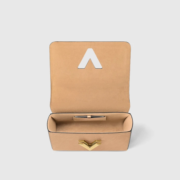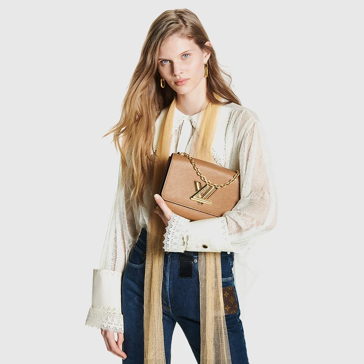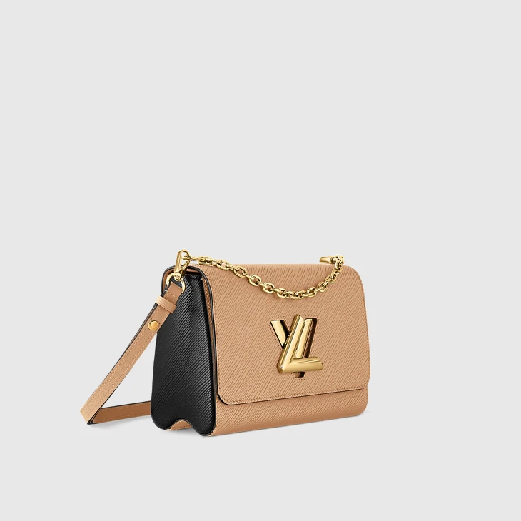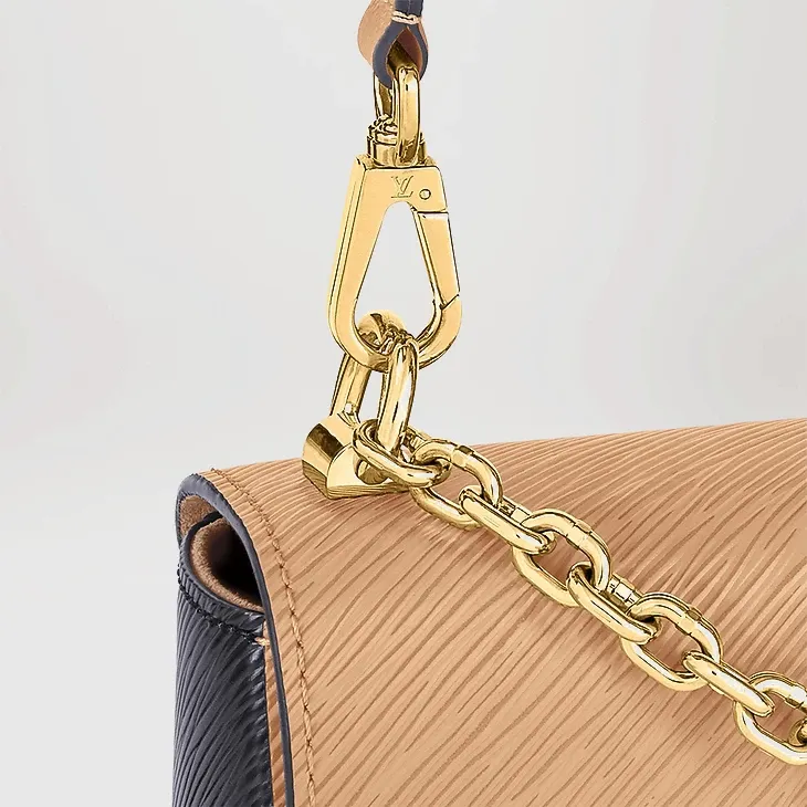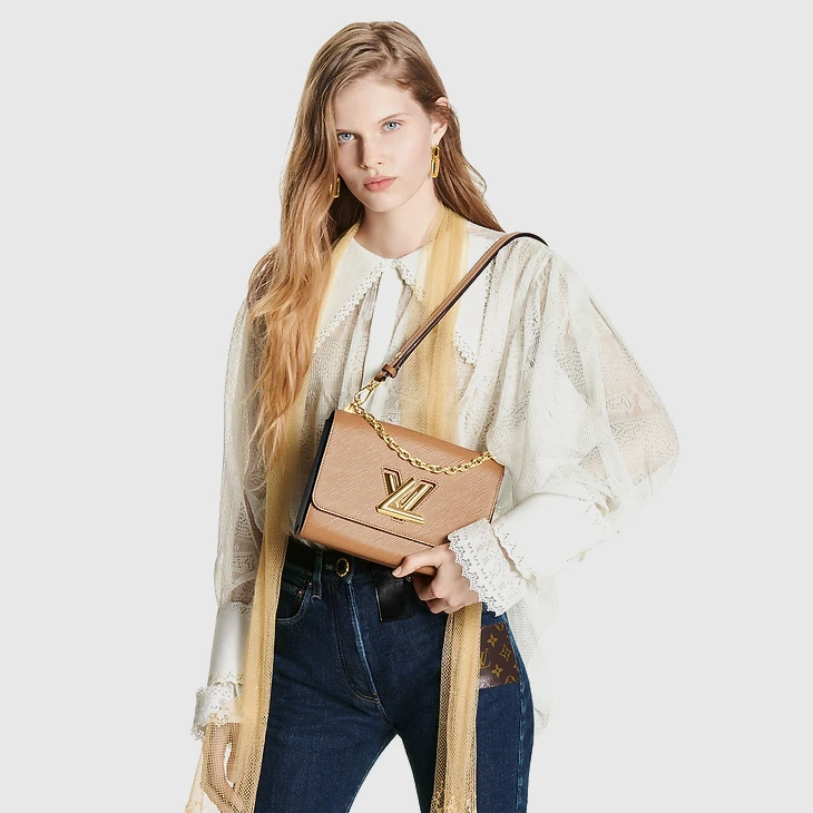 Crafted from the House’s emblematic Epi leather, the Twist MM chain bag features the now-iconic LV Twist lock, a sculptural signature in gleaming golden metal.This Twist MM handbag in Camel Epi leather edged with black is offered with a leather strap, for more carry options. For day, it can be worn over the shoulder or cross-body. Held by the short chain handle (with the strap removed) the bag becomes an ideal accessory for evening looks.